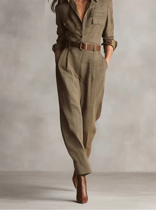 Izrađen od visokokvalitetnog materijala sa klasičnim kariranim uzorkom, savršeno naglašava siluetu, pružajući istovremeno udobnost tokom celog dana. Pojas u struku lepo oblikuje figuru, a blago podvrnuti rukavi daju celini opušteni, modni karakter.
